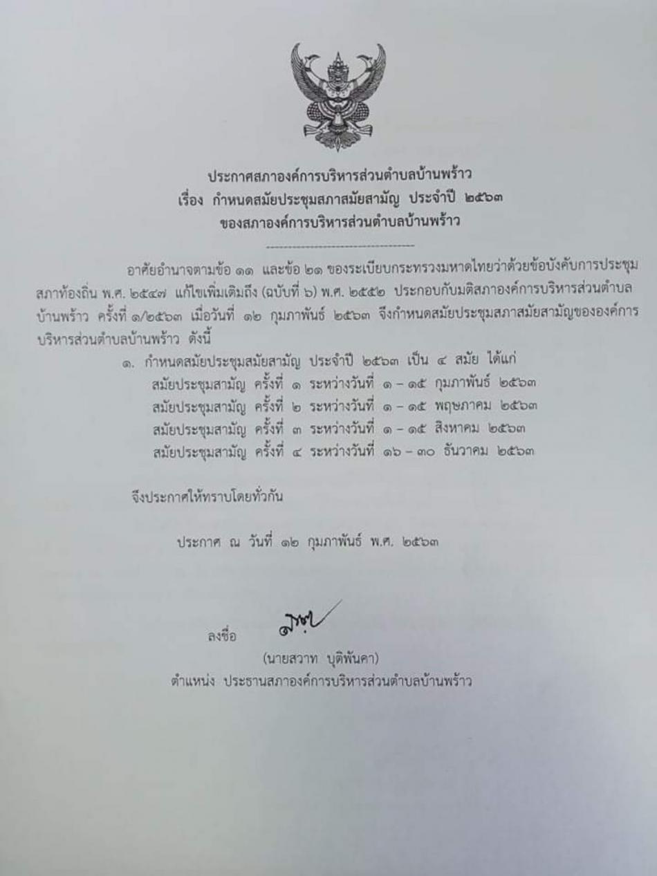 ประกาสภาองค์การบริหาร่วนตำบลบ้านบ้านพร้าว กำหนดสมัยประชุมสภาสมัยสามัญ [12 กุมภาพันธ์ 2563]